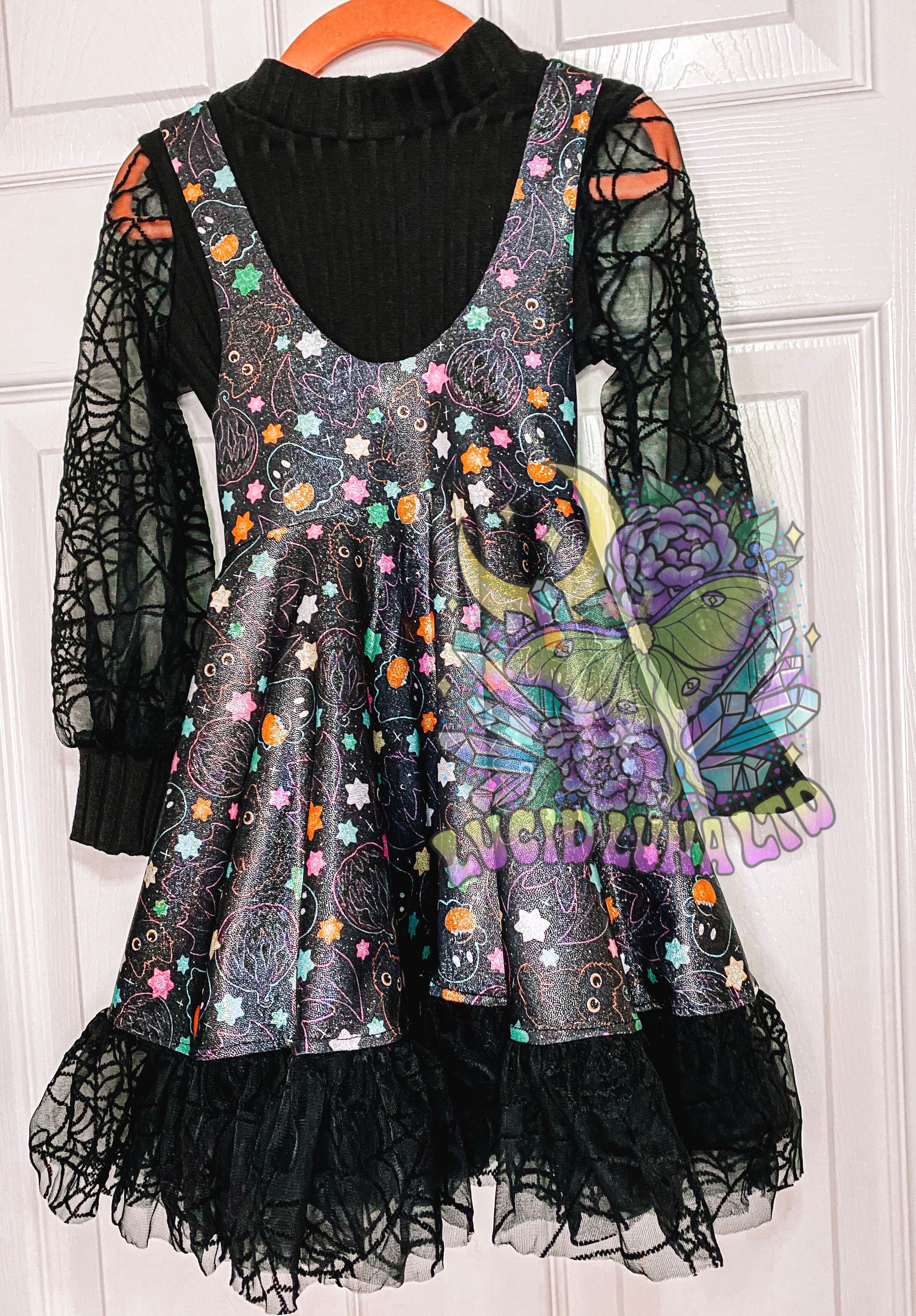 Dress to impress with this 4T Indy Pinafore Dress and Benicia Top combo! The holographic dress features a black velvet spiderweb mesh hem ruffle for extra flair, while the rib sweater knit mock neck top adds a touch of warmth and style with its matching velvet spiderweb mesh bishop sleeves. A winning combination for year round Spooky Season!