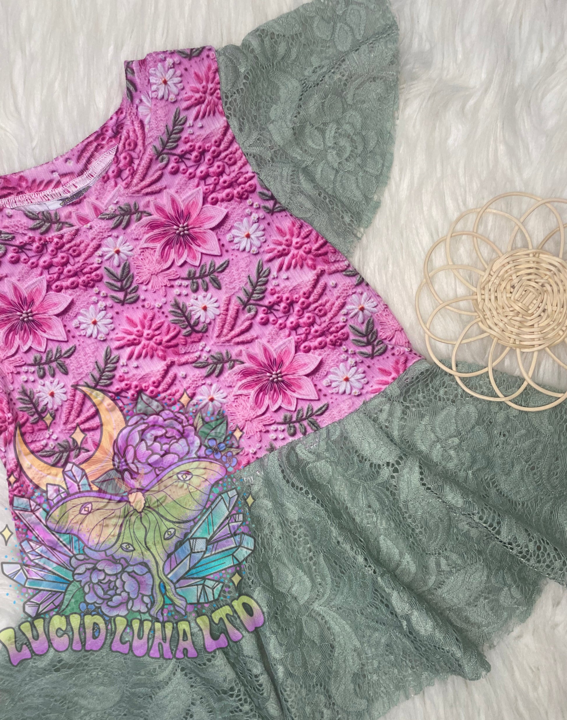 This Flutter Sleeve Peplum top is the perfect addition to any little girl's wardrobe. The soft skinny rib knit bodice provides comfort while the floral faux embroidery holiday print adds a touch of elegance. The lace skirt and flutter sleeves with raw hems give a whimsical touch to this must-have top! Size: 5 youth