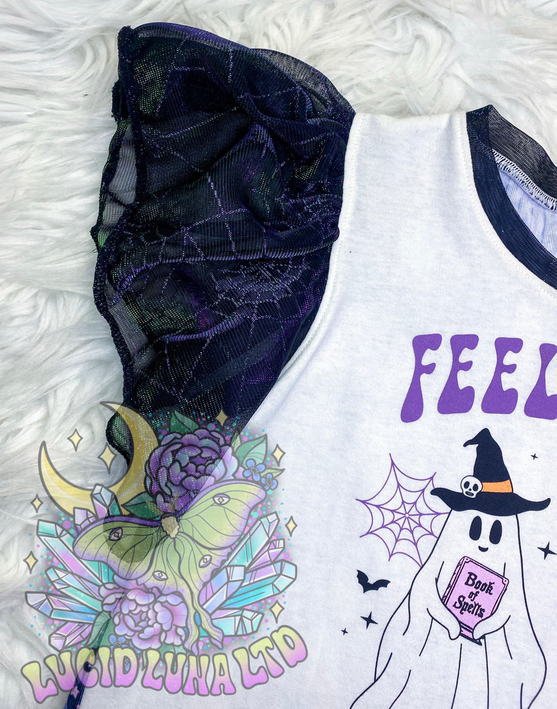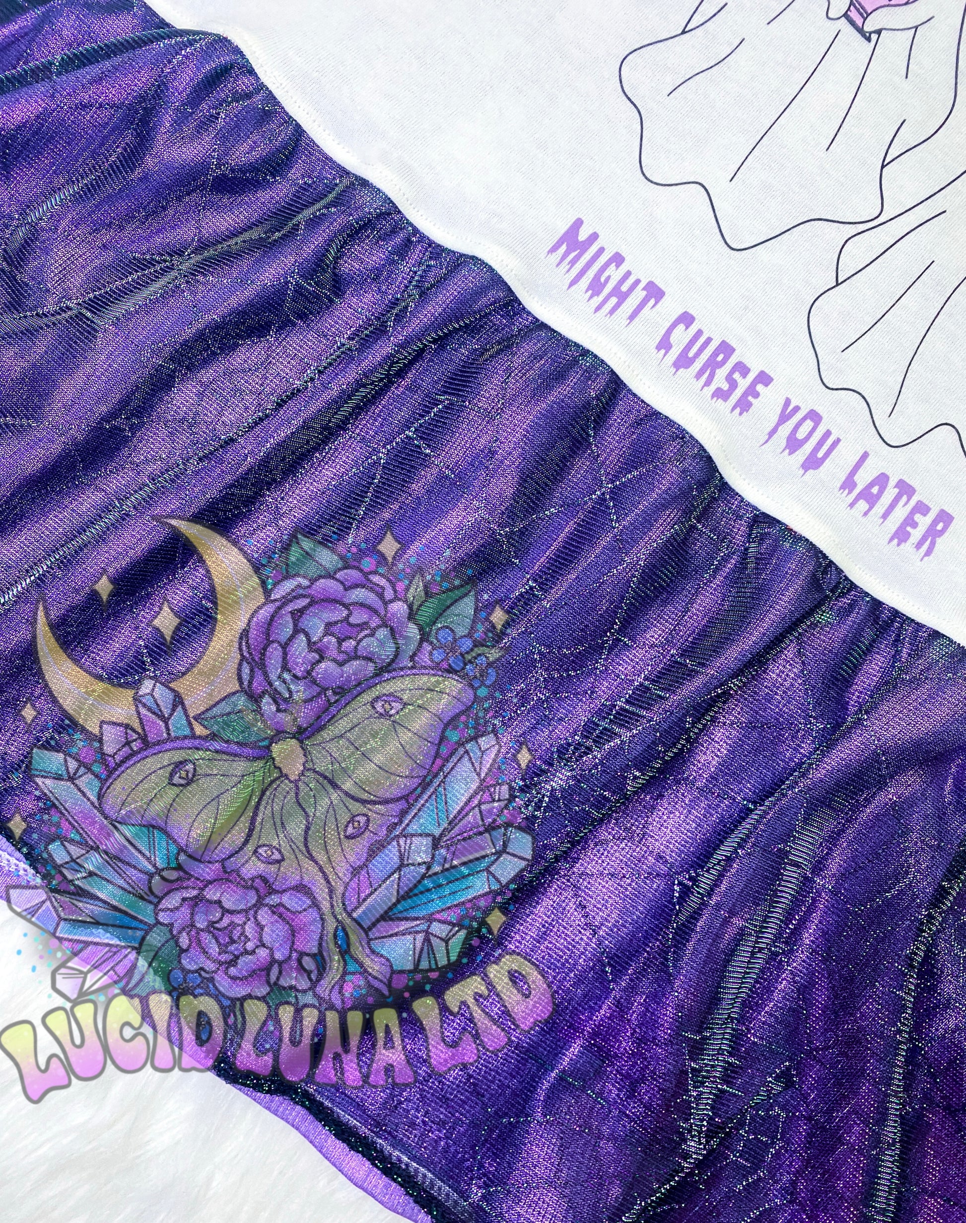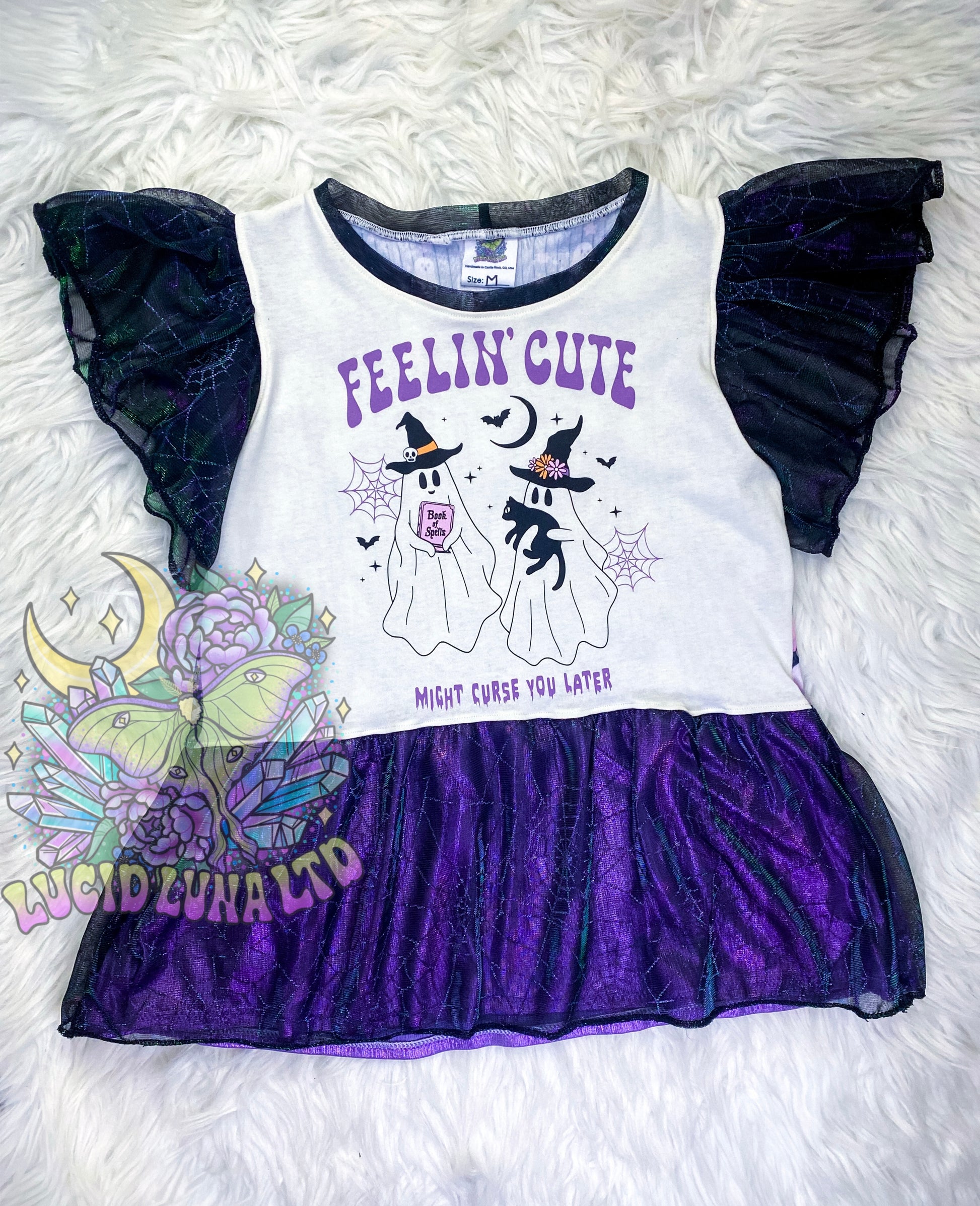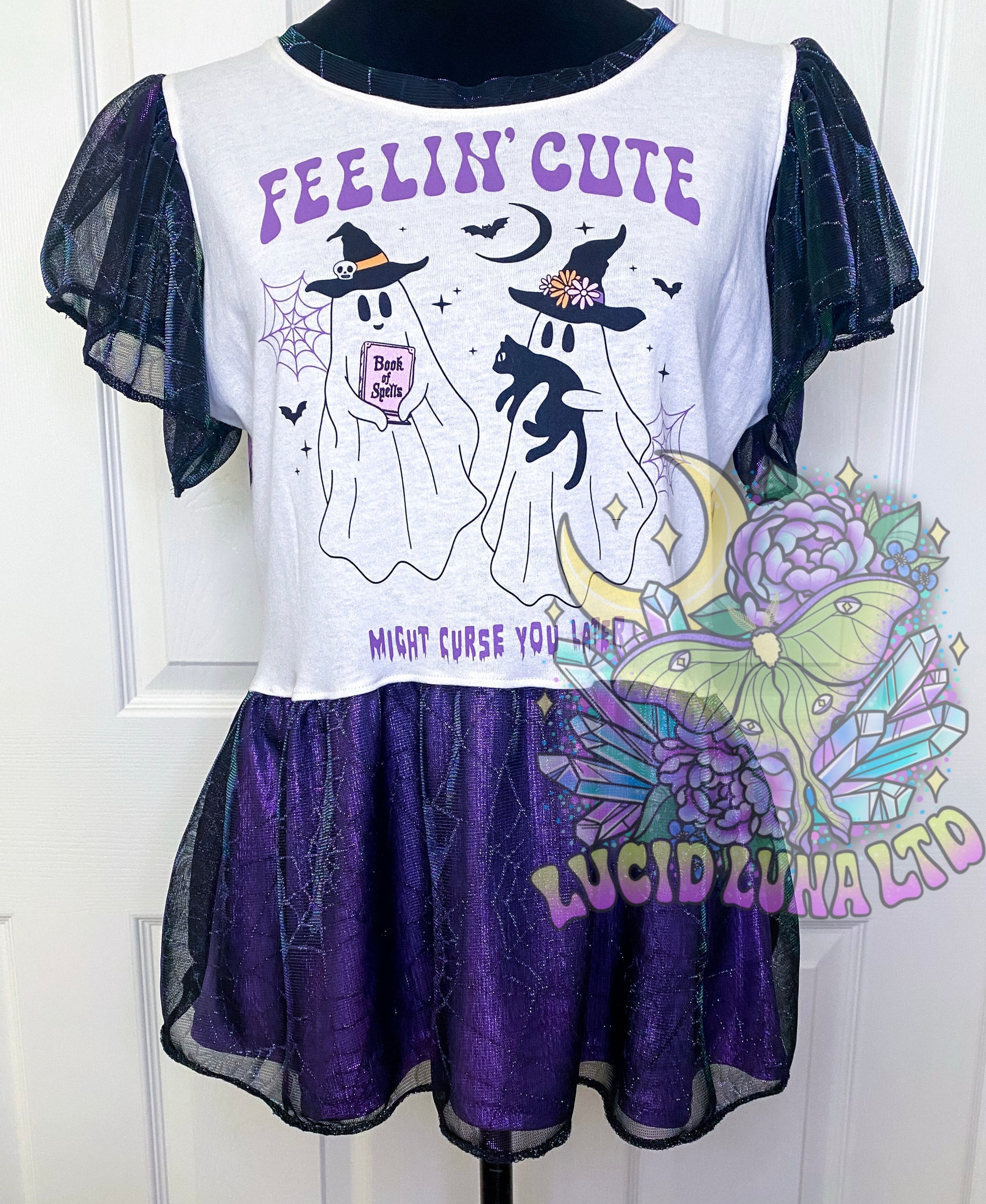 Take a risk and stand out in our Women's Flutter Sleeve Peplum Upcycle! Made from an upcycled cotton t-shirt, this shirt features a custom printed rib knit back and a stunning lilac foil spandex skirt with metallic spiderweb mesh overlay. The matching flutter sleeves add a touch of boldness. Size medium. Go for it!